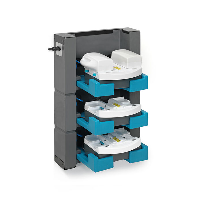 Mit dem i-stack Wandladegerät laden Sie Ihre i-power Akkus für den i-mop bequem und platzsparend auf.. In Umgebungen, in denen Platz knapp und jeder Zentimeter kostbar ist, bietet das i-stack eine platzsparende Lösung für das Laden von Akkus. Das i-stack wird modular aufgebaut über mehrere Etagen von 1 bis 6. Wählen Sie je nach Bedarf die Anzahl der Lade-Etagen. Stecken Sie die einzelnen Komponenten einfach zu einer Einheit zusammen. Dadurch haben Sie die Flexibilität, die Ladekapazität Ihren individuellen Anforderungen anzupassen, ohne dabei zusätzlichen Platz zu beanspruchen. Dieses feste Wandladegerät bietet die gleiche Funktionalität wie andere Wandladegeräte mit mehreren Etagen, ist jedoch flexibler und kann auf seinem Sockel überall platziert werden, um Ihren Bedürfnissen optimal gerecht zu werden.
