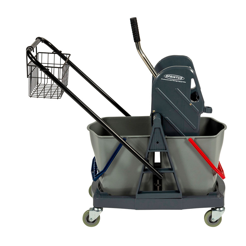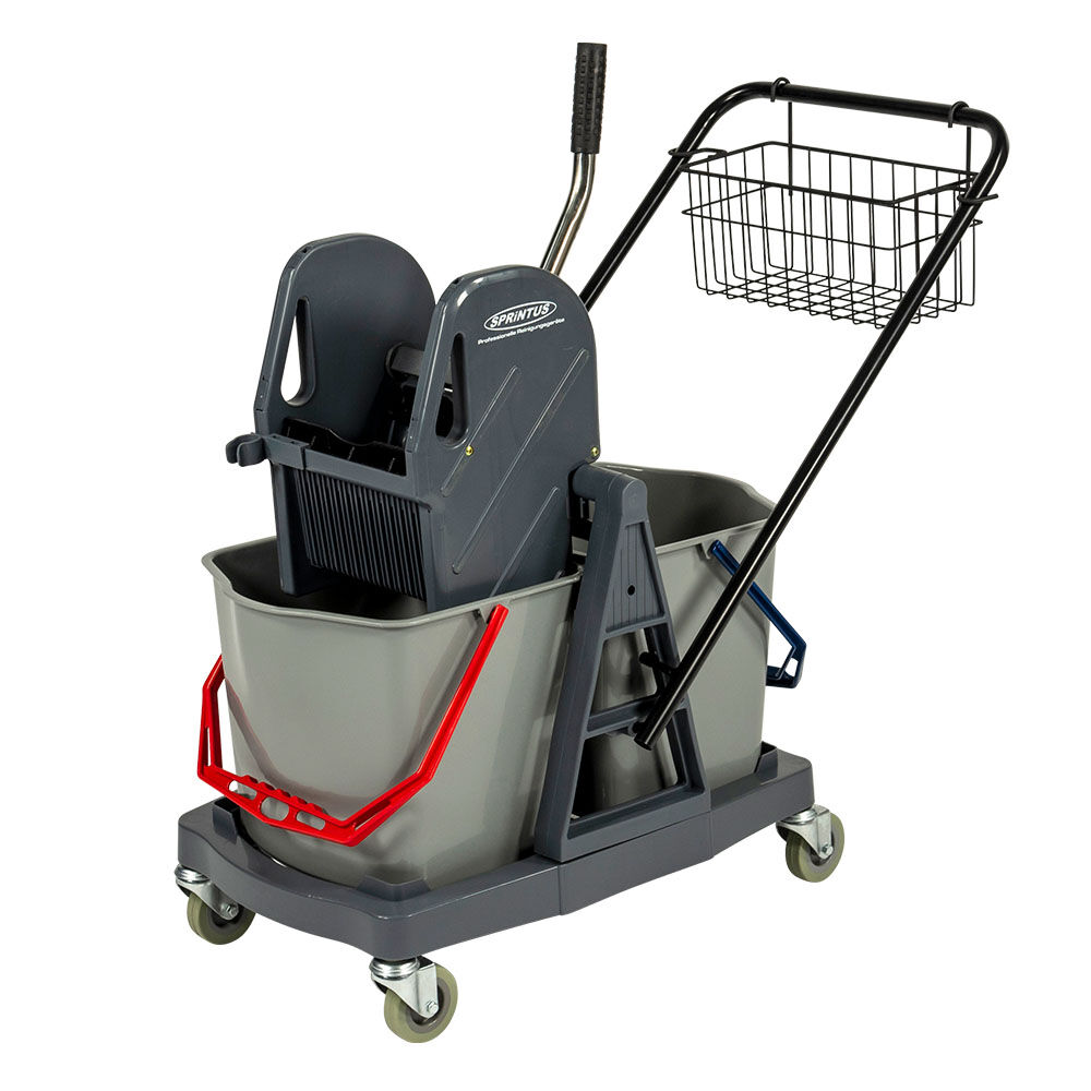 Stabiler Doppelfahreimer der Marke Sprintus. Aus Kunststoff, mit Schubbügel und Lenkrollen aus Metall. Inklusive sind zwei Eimer in unterschiedlichen Farben sowie eine Doppelbacken-Presse für Mopps.