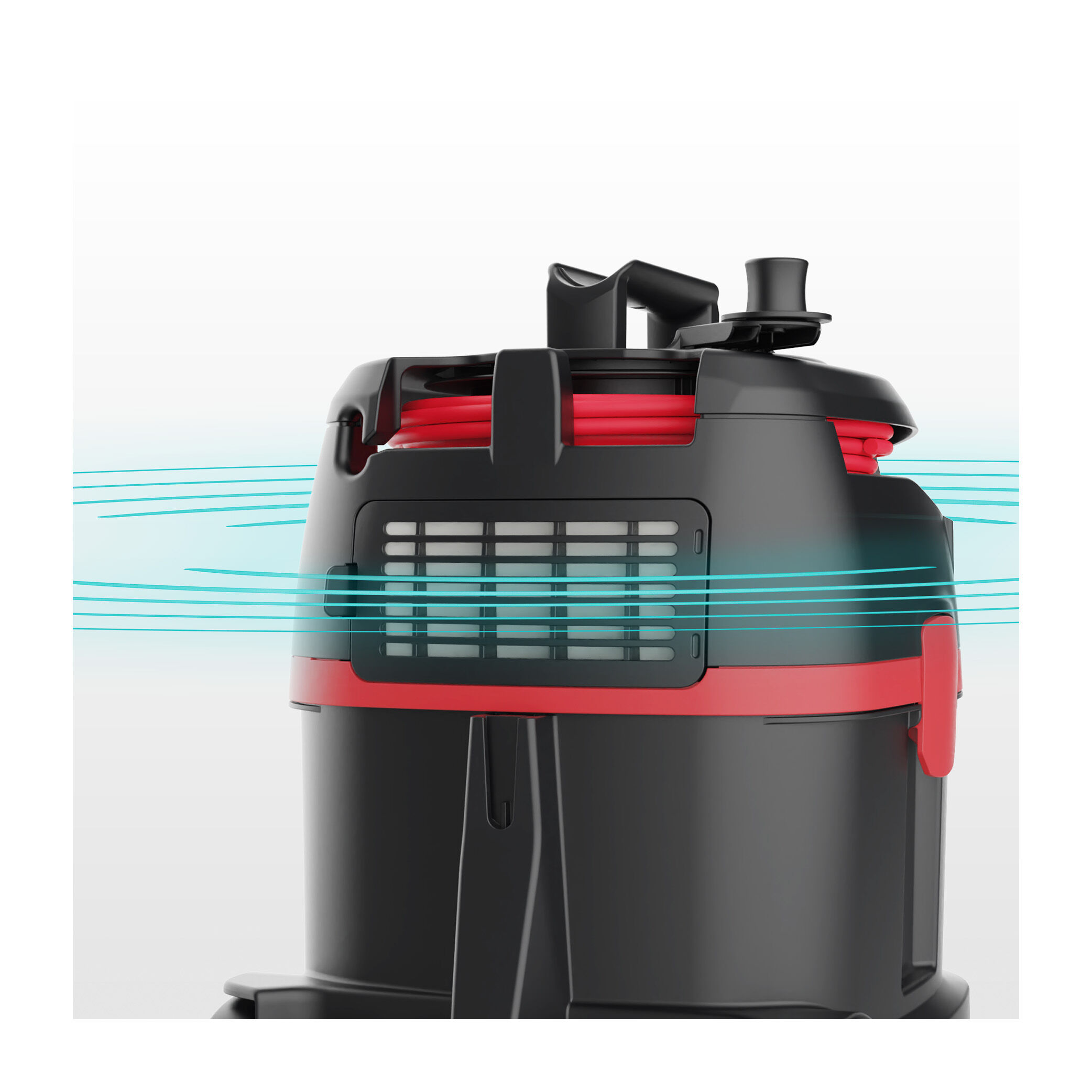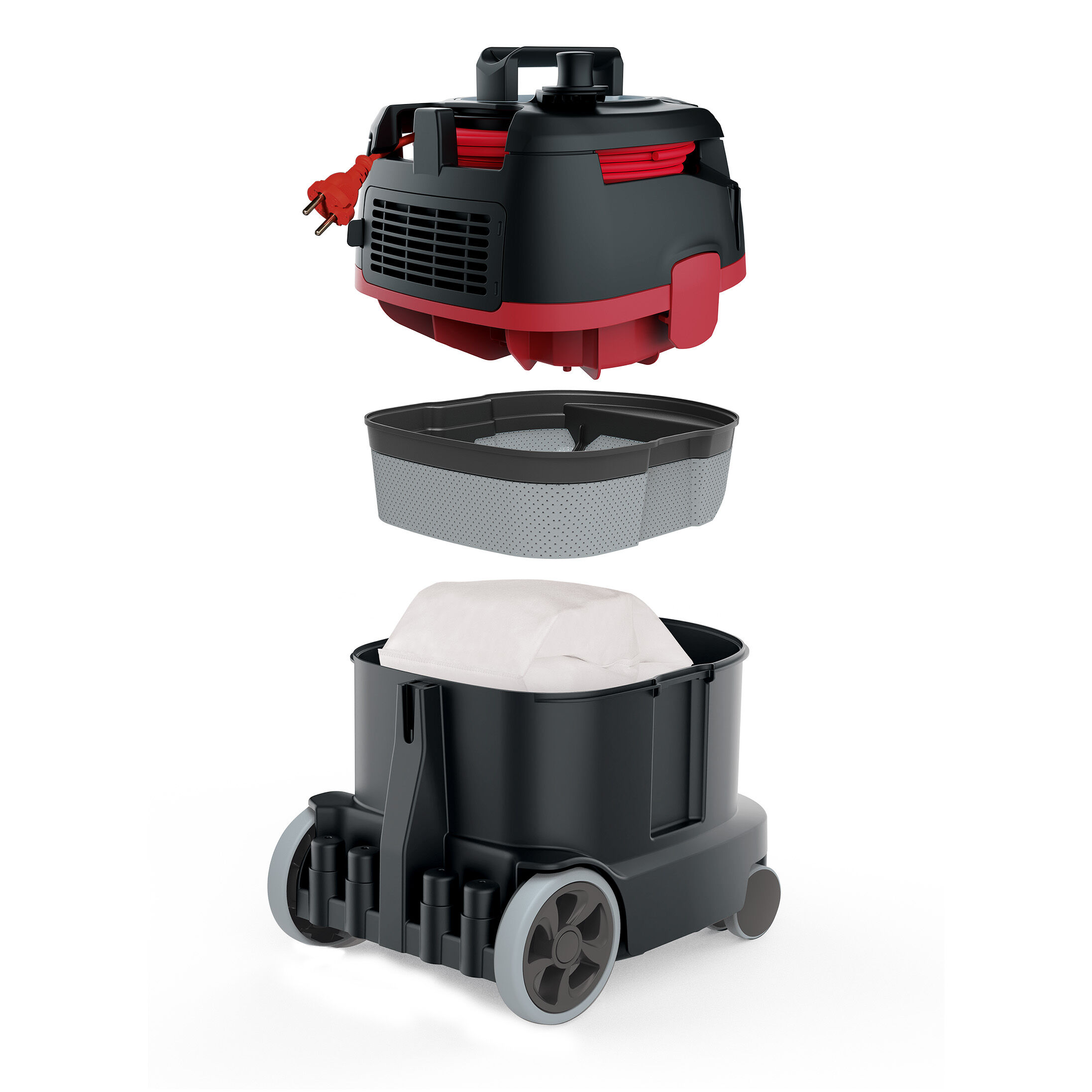 Lieferumfang: inkl. Teleskoprohr, Saugschlauch 2,5 m, Vliesfilterkorb, HEPA13 Vliesfiltertüte, HEPA13 Filterkassette, Fugendüse, kombinierte Polster- / Möbeldüse, Kombidüse 280 mm, Netzkabel 12 m, steckbar, signalrot.