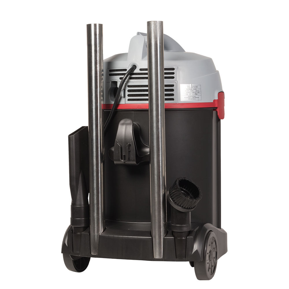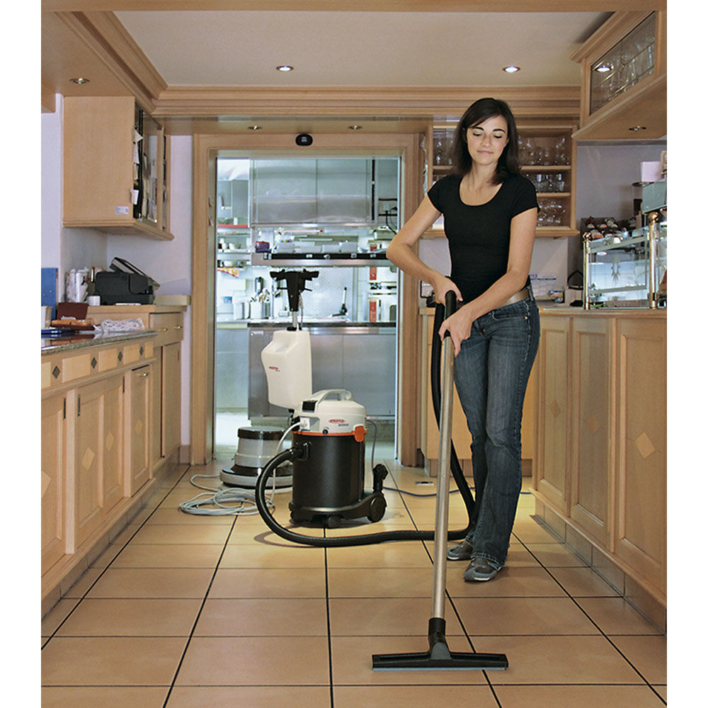 Waterking – der ideale Sauger für Gebäudereiniger. Hervorragend für die Grundreinigung geeignet. Der Waterking ist der ideale Sauger in der 30 Liter-Klasse für den Gebäudereiniger. Extrem leistungsfähig (260 mbar Unterdruck bei 70 l/Sek. Luftfördermenge), ermöglicht der Waterking in Verbindung mit den 360 mm breiten Bodendüsen eine hervorragende Flächenleistung. Die mechanische Leistungsregulierung ermöglicht die optimale Einstellung auf jeden Belag. Durch die integrierte Blasfunktion können Filter aus-, Werkbänke ab- oder Flächen trockengeblasen werden. Das optimale Handling mit Zubehöraufbewahrung, Kabelaufwicklung, Schlauchaufbewahrung, Parkposition des Sauggeschirrs und ergonomischem Griff machen den Sauger fit für den professionellen Einsatz. Eine leistungsstarke Steckdose ermöglicht den Betrieb von zusätzlichen Reinigungsmaschinen direkt über den Sauger.