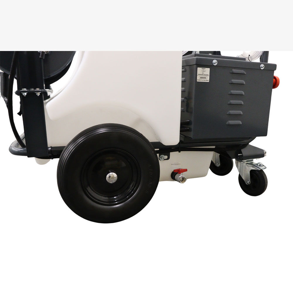 Reinigen Sie Pflastersteine, Gehwege und andere Flächen im Außenbereich ohne einen Netz- oder Wasserzugang. Der Tornado E Mini ist dank Akku und Wassertank völlig unabhängig. Sie haben eine Reinigungsaufgabe in schwer zugänglichem Gelände? Für den Mini-Tornado kein Problem. Denn dank der großen Reifen und dem kompletten System auf einem mobilen Wagen erreichen Sie jede Stelle.