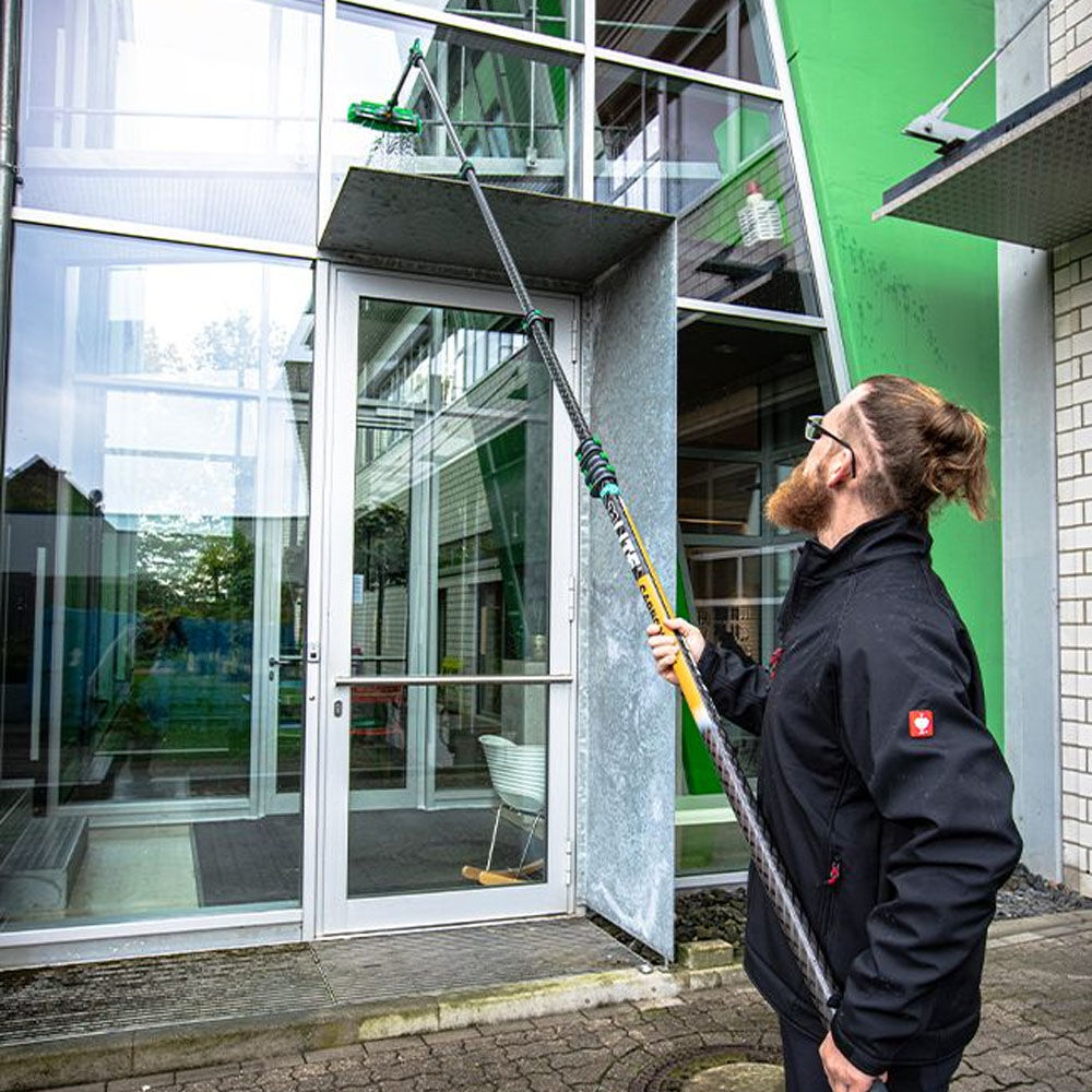 Die wasserführende Stange für die Glasreinigung besteht aus Premium-Karbonfaser mit 24.000 Fasern pro Bündel. Dadurch erhält die Stange auch bei voller Länge eine hohe Stabilität, Steifigkeit und Belastbarkeit (bis 210 GPa). Der Querschnitt der Teleskopstange ist nicht rund, sondern hat die ovale PrecisionGrip Stangenform. Die an die Hand angepasste Form sorgt für ein präziseres und ergonomisches Handling. Außerdem verhindert die ovale Form das Verdrehen der Stange, zusätzlich werden die Klemmen zum Festhalten der Stangenelemente geschont. Die Hauptstange ist auf 8,60 m ausziehbar. Sollte das nicht reichen, können Sie mit Hilfe des im Set enthaltenen Adapters die Hauptstange mit der Erweiterungsstange verbinden. So kommen Sie zusammen auf nahezu 12 m Länge. Die einzelnen Teleskopelemente lassen sich mit den SmartLock-Klemmen sicher und einfach fixieren. Nur ein Handgriff ist nötig, um die Klemmen zu lösen und wieder festzustellen. Der hochflexible DuroFlex-Schlauch kann wahlweise im Inneren der Stange oder außen an der Stange entlang verlegt werden.