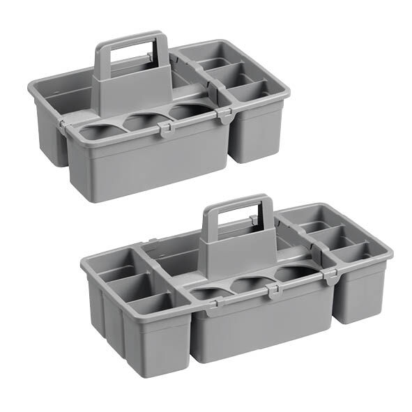 Praktische Transporthilfe für Reinigungsmittel und Tücher Robuste und handliche Tragebox mit Griff und Einleger für 3 Flaschen. Mit dieser Tragebox aus Kunststoff haben Sie bis zu drei Flaschen mit Reinigungschemie sowie Ihre Schwämme und Mikrofasertücher stets griffbereit. Ideal für Reinigungsarbeiten unterwegs! Produkteigenschaften Größe:  33,5 x 28 x 27 cm Farbe: grau Gewicht: 0,522 kg Material:  Polypropylene Copolymer VE: 1