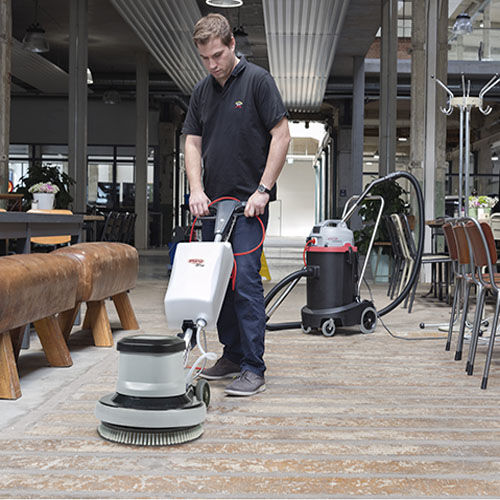 Handliche Exzenter-Einscheibenmaschine EEM13R Bäder, Spa-Bereiche, Toiletten, Umkleideräume, Treppen, Fliesen, alle Hartflächen und Teppichböden. Die EEM 13 R Exzenter-Einscheibenmaschine ist durch ihre kompakte Bauweise und die einfache Bedienung ideal für die Reinigung kleiner Flächen, Nischen und Ecken. Durch das geringe Gerätegewicht von nur 12,7 kg ist sie auch für den Einsatz auf Treppen geeignet. Der Exzenterantrieb sorgt für effektive Reinigung und für problemlose, sichere Führung ohne Kraftaufwand. Die großen gummierten Räder ermöglichen einen bequemen Transport, ohne Spuren zu hinterlassen. Mit dem Zubehör im Lieferumfang lassen sich Hartflächen reinigen, Stein- oder Parkettböden polieren und Teppiche schamponieren. Vorteile kraftvoller Exzenterantrieb kompakte Bauweise für einfaches Handling sichere Führung ohne Kraftaufwand komplettes Zubehör für alle Untergründe Zubehör, im Lieferumfang inbegriffen Schrubbbürste 280 mm Schamponierbürste 280 mm Pad-Treibteller 254 mm Netzkabel 7,5 m, signalrot Optionales Zubehör Pad weiß 13’’ (VE 5 Stk.) Pad rot 13’’ (VE 5 Stk.) Pad grün 13’’ (VE 5 Stk.) Pad schwarz 13’’ (VE 5 Stk.) Queen Bonnet Pad 13’’ (330 mm) Power Pad 13" Anbauset Pumpentank für EEM 13 R Wir bestellen gerne für Sie weiteres Zubehör für den Sprintus EEM13R Einscheibenmaschine!! Rufen Sie uns an oder schreiben Sie uns eine Nachricht! Technische Daten Netzspannung: 220-240 V / 50 Hz Leistung: 250 W Schalldruckpegel: 62 LpA [dB] Bürstendrehzahl: 150 U/Min. Max. Scheibendurchmesser:   10‘‘ / 254 mm Durchmesser Treibteller: 13‘‘ Gewicht: 12,7 kg Kabellänge: 6 m Herstellervideo zum Sprintus EEM13R Einscheibenmaschine