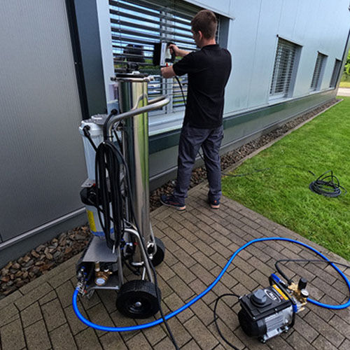Bieten Sie Ihren Kunden eine professionelle Reinigung von Außenjalousien oder Fensterläden mit dem Cleantecs Lamellenreiniger und dem MOBI Maxi Double RO-System! Zu einer strahlenden Fassade und glänzenden Fenstern gehören auch saubere Jalousien. Nicht nur für das gute Aussehen, sondern auch für den Wert- und Funktionserhalt sollten Außenjalousien regelmäßig von natürlichen und atmosphärischen Verschmutzungen befreit werden. Eine schnelle und umweltschonende Reinigung garantiert die Kombination von dem Cleantecs Lamellenreiniger und der Reinigung mit Reinwasser. Die Reinwasserherstellung übernimmt dabei der MOBI Maxi Double bedarfsgerecht und vor Ort. Dank seiner zwei Membranen kann er mehr als 11 Liter Reinwasser in der Minute produzieren. Schließen Sie den MOBI Maxi Double direkt an den Hochdruckreiniger an und sparen Sie so den umständlichen Puffertank! Der Hochdruckreiniger treibt mit dem Reinwasser die rotierenden Bürsten des Cleantecs Lamellenreinigers an. So reinigen Sie schnell und effektiv und das Beste: Das Reinwasser benötigt keine Zugabe von Reinigungschemie und trocknet rückstandslos ab! Perfekte Ergebnisse in nur einem Arbeitsgang! Der Cleantecs Lamellenreiniger ist mit knapp 2 Kilogramm sehr leicht und daher auch bei längeren Einsätzen gut zu führen. Der Bürstenabstand kann individuell eingestellt werden und genauso mühelos gelingt der Bürstentausch, dank Schnellwechselsystem. Das Set beinhaltet außerdem einen Hochdruckreiniger, einen passenden Hochdruck-Flexi-Schlauch, den Cleantecs Transportkoffer für den Lamellenreiniger und den Spritzschutz. Damit Sie bei den Reinigungsarbeiten trocken bleiben!
