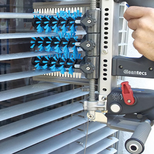 Cleantecs LR-180-GTR Lamellenreiniger für die professionelle Reinigung von Außenjalousien und Raffstores Mit dem LR-180-GTR Lamellenreiniger von Cleantecs erhalten Sie Profi-Reinigungstechnik zur schnellen und effektiven Reinigung von Jalousien und Raffstores im Außenbereich. Nutzen sie dieses Lammellenreinigungsgerät in Verbindung mit einem Hochdruckreiniger (nicht im Lieferumfang enthalten). Der moderne Sonnenschutz ist tagtäglich Wind und Wetter, Schmutz und Emissionen ausgesetzt. Staub, Pollen und Vogeldreck werden durch starke Sonneneinstrahlung regelrecht in das Material eingebrannt. Damit bei einer kostenintensiven Außenjalousie Wert und Funktion lange erhalten bleiben, müssen sie regelmäßig gereinigt werden – und das am besten professionell. Der Lamellenreiniger LR-180-GTR von Cleantecs ist eine durchdachte Lösung für die schnelle, umweltschonende Reinigung von Außenjalousien. Ganz leicht in Handhabung, Wartung und Pflege – und mit 1,9 kg auch in punkto Gewicht. Dafür sorgt die innovative, motorlose Technologie, bei der eine Wasserturbine die Reinigungsbürsten rotieren lässt. Mit einem Handgriff lässt sich der Bürstenabstand individuell einstellen – genauso mühelos funktioniert auch der Bürstentausch dank Schnellwechselsystem. Lamellenreinigung mit Hochdruck und rotierenden Bürsten Über das Hochdruckgerät speisen Sie den Cleantecs Lamellenreiniger mit mindestens 10 Litern Wasser pro Minute. Mit Wasserkraft werden dann die Bürsten angetrieben. Die Rotation der Bürste sorgt dafür, dass Sie für die Reinigung weniger Kraft aufwenden müssen. Die drei übereinander angeordneten Rundbürsten säubern die Lamellen von beiden Seiten inklusive Führungsbänder! Lesen Sie für mehr Informationen auch unseren Know-how Beitrag zum Thema Lamellenreinigung. Der Bürstendurchmesser von 80 mm eigent sich für Standard-Lamellen mit Abständen von 5–10 cm. Häufig haben die Lamellen der Raffstores eine Tiefe zwischen 7–10 cm, daher sind Sie mit einer Bürstenlänge von 12 cm gut bedient. Mit dem Cleantecs Lamellenreiniger sind Sie auf die gängigsten Bauweisen von Raffstores und Außenjalousien vorbereitet. Passen Sie den Bürstenabstand gleichmäßig und individuell an, indem Sie die Spindel am oberen Ende des Bürstensatzes drehen. Der Wasserzufluss kann mit einem Hebel direkt am Gerät ein- und ausgeschaltet werden.  Cleantecs: Lamellenreinigung inklusive Zug- und Leiterbänder Durch die automatisierte Reinigung der rotierenden Bürsten werden alle Elemente eines Raffstore mit gereinigt. So sparen Sie sich einen Arbeitsgang. Die Führungsbänder an den Lamellen bearbeiten Sie mit dem Cleantecs Lamellenreiniger direkt mit. Für Ihre Kunden bedeutet das insgesamt eine schnelle Reinigung und ein stimmiges Endergebnis mit komplett gereinigten Raffstores. Jeikner-Service für Sie: Möchten Sie den Cleantecs Lamellenreiniger in der Anwendung erleben? Vereinbaren Sie einen individuellen Vorführungstermin mit uns! Sie erreichen uns unter Tel. 02737-21395-0 oder per Mail an info@jeikner.de Einfaches Handling des Cleantecs Lamellenreiniger geringes Gewicht: ca. 1,9 kg wartungs- und pflegeleicht: Gerät kann komplett zerlegt werden Wasserzufluss direkt am Lamellenreiniger schaltbar Schnellwechselsystem für den unkomplizierten Bürstentausch für Lamellengröße 5–10 cm Durchdachte Funktionen für Lamellenreinigung für bis zu 160 bar Wasserdruck und 60°C Rotation der Reinigungsbürsten mittels Wasserturbine Bürstenabstand axial auf Lamellenabstand anpassbar verstellbare Sprühdüsen Gerätestütze für das schonende Abstellen – als Handgriff umklappbar integrierter Filter gegen VerschmutzungLieferumfang:1 x Lamellenreiniger LR-180-GTR3 x Bürsten, 80 mm Technische DatenBetriebsdruck:100-120 barFlächenleistung:60 m²/hTemperatur:max. 60 °C Bürsten-Ø: 80 mmWasserverbrauch:ca. 10 L/Min.Tiefe:12  cmBaugröße:300 x 320 x 260 mmGewicht:ca. 1,9 kgAnschluss: M22 x 1,5 AG VE:1