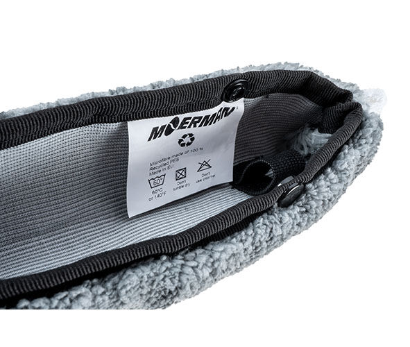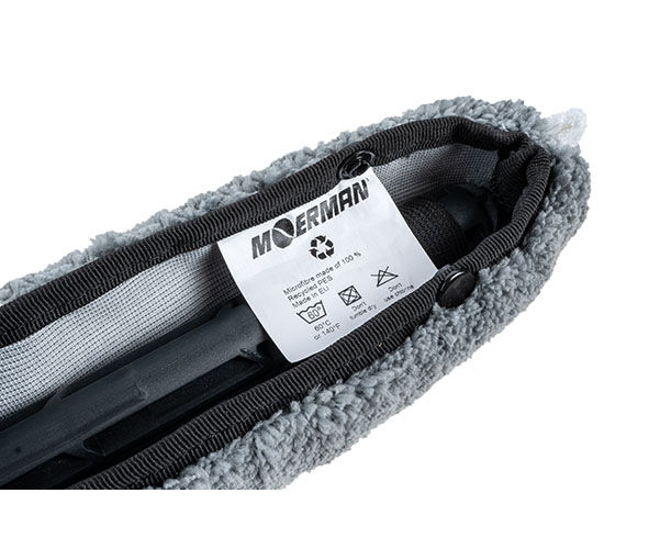 Der Baobab Mikrofaser-Bezug von Moerman besteht zu 100 % aus recyceltem Kunststoff, welcher aus europäischen Abfällen gewonnen wurde. Im Arbeitsalltag besticht der graue Bezug durch seine extrem hohes Wasserrückhaltevermögen. Das weiße Schrubb-Pad an der Seite des Einwaschers entfernt hartnäckigen Schmutz auf Glasflächen. Damit Sie den Bezug möglichst lange verwenden können, hat sich der Hersteller Moerman für robuste Druckknöpfe zum Verschließen des Bezugs entschieden. In der Regel halten diese länger als Klettverschlüsse.