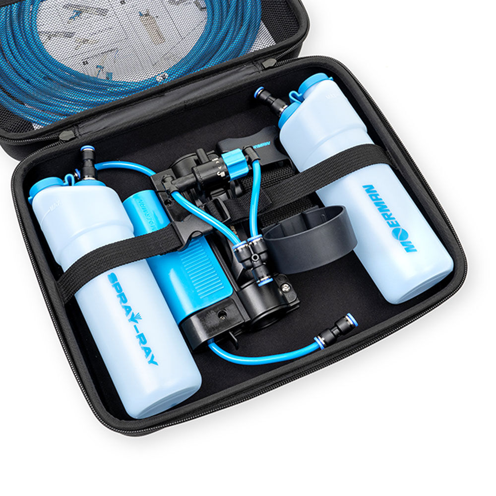 Die manuelle Pumpe kann mühelos an den Moerman-Teleskopstangen befestigt werden und wird mit einem 30 Fuß langen, hochwertigen Schlauch geliefert, der leicht zugänglich ist. Der Düsenkopf bietet universelle Kompatibilität und lässt sich nahtlos sowohl am Gekko Pad Holder als auch am Excelerator 2.0 mit Fliq Pad anschließen. Für den einfachen Transport und die Lagerung ist eine strapazierfähige Hardcover-Tragetasche im Lieferumfang des Sets enthalten.