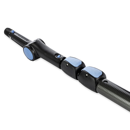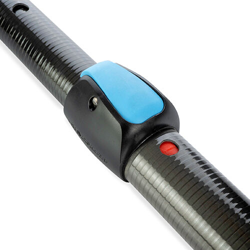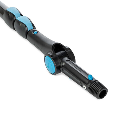 Die dreiteilige Karbon-Glasfaser Stange lässt sich sehr einfach ausziehen und zusammenschieben. Die Arretierung lösen Sie durch Druck mit dem Daumen auf die türkisen Tastklemmen. Einrastpunkte in kleinem Abstand ermöglichen eine individuelle Höhen-Einstellung. Die Takumi Deluxe-Stange ist kompatibel mit den Konen von Moerman, wird standardmäßig aber mit dem Dr. Angle Mini Winkelaufsatz ausgeliefert. Vorteile: Durch das Schraubgewinde können Sie allen Bürsten mit Drehgewinde auf der Stange nutzen und der Arbeitswinkel lässt sich nahezu stufenlos anpassen.