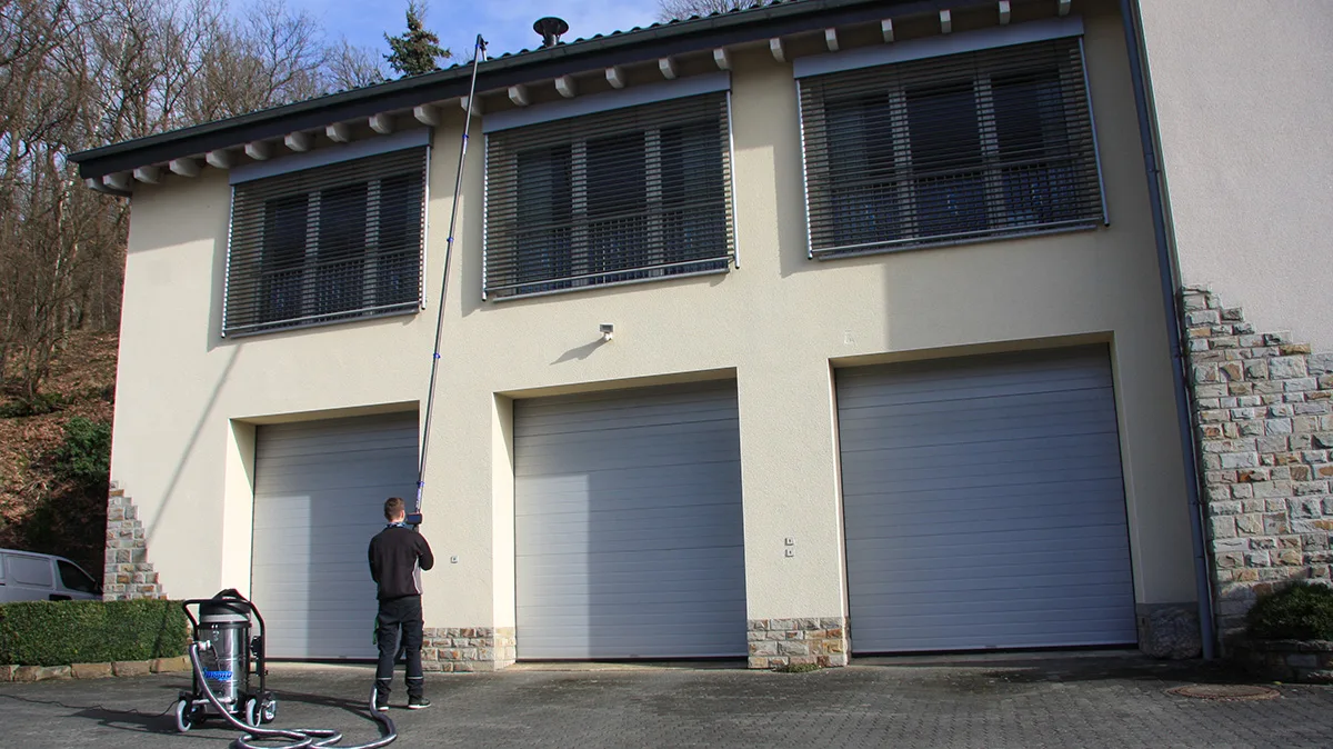 Dachrinnenreinigung in bis zu 12 Metern Höhe ohne Leiter mit Hochleistungs-Saugern.
