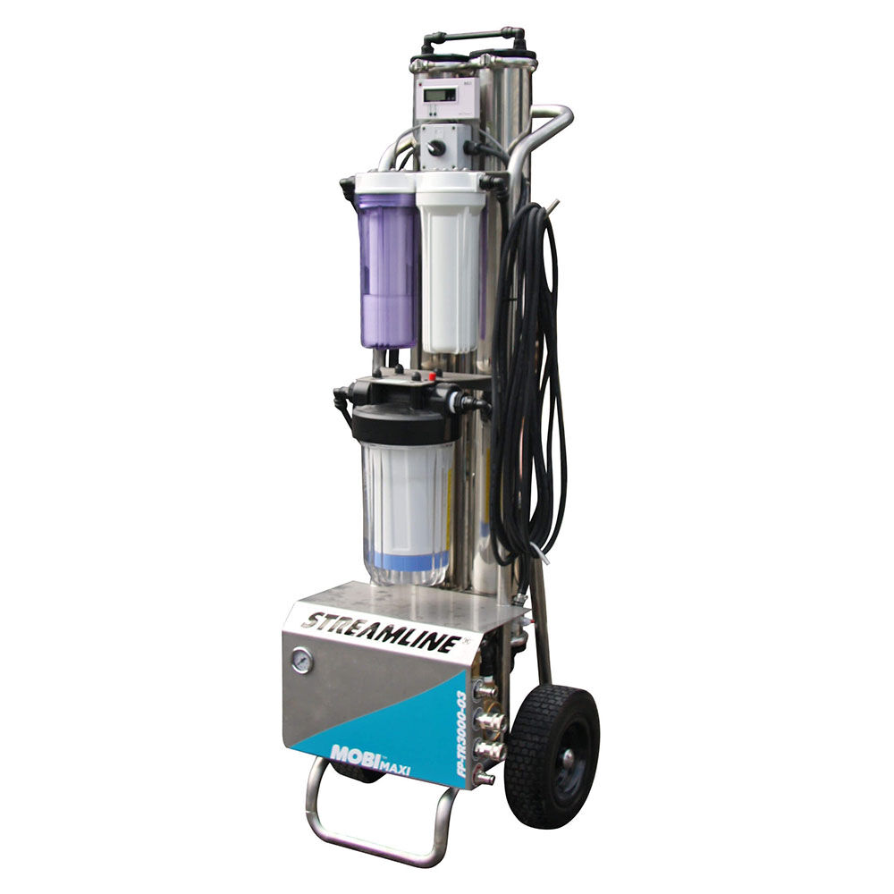 Streamline MOBI Maxi Double: perfektes RO-System für Hochdruckreiniger und Lamellenreiniger Der Streamline MOBI MAXI Double punktet mit seinen zwei Membranen. Warum eine zweite Membran erforderlich ist? Damit Sie Zeit beim Arbeiten mit dem Hochdruckreiniger sparen! Dank Doppelmembran lassen sich mehr als 11 Liter Reinstwasser pro Minute direkt vom MOBI MAXI Double in den Hochdruckreiniger leiten. Somit ist kein Puffertank erforderlich und die Auf- und Abbauzeiten für die Reingungsarbeiten werden auf ein Minimum reduziert.  Zuverlässiges Osmoseverfahren für die professionelle Glasreinigung Das mobile Filtrationssystem STREAMLINE MOBI MAXI Double empfehlen wir zur fleckenfreien Außenreinigung von Fenstern und anderen Glasflächen, Solaranlagen-Reinigung, Reinigung von Außenbereichen von Booten und anderen Anwendungen in der Außenreinigung.  Bei vorhandener Wasser- und Netzstromversorgung (230 V), erzeugt das STREAMLINE MOBI MAXI-Filtersystem genügend Wasser und Druck, um von zwei Anwendern gleichzeitig für Reinigungsarbeiten genutzt zu werden. Der MOBI MAXI ist die perfekte Lösung für Dienstleister in der Gebäudereinigung und für Glasreiniger. Vorteile kompakter, robuster und stabiler Rahmen kann in horizontaler oder vertikaler Position betrieben werden großes Membrangehäuse aus Edelstahl mit 2 Membranen FILTERPLUS 4040 Manometer zur Überwachung des Drucks im Membrangehäuse lüftergekühlte Industrie-Druckerhöhungspumpe, 8,2 bar, 230 V inkl. Inline-TDS-Messgerät; überwacht die Wasserqualität nach der RO-Filterung und nach der abschließenden DI-Polierfilterung Lieferung komplett mit Schlauchanschlüssen für Einlass, Auslass und Abwasseranschlüsse – geeignet für 1 oder 2 Nutzer, mit separaten Anschlüssen 5 m Stromkabel  JEIKNER Profi-Tipp: Das Osmosegerät Mobi Maxi Double ist nicht nur die perfekte Ergänzung zum Cleantecs Lamellenreinigungsgerät sondern kann auch BG BAU als Arbeitsschutzprämie gefördert werden! Weitere Infos dazu auf der Webseite der BG BAU. Technische Daten Filtrationsarten: Karbon Vor-Filter, Umkehrosmose-Membran, DI-Filter max. Druck: 120 psi / 8,27 bar max. Durchflussgeschwindigkeit: ca. 11 Liter / Minute* geeigneter TDS-Wert Eingangswasser: 100-600 ppm endgültiger TDS-Wert Ausgangswasser:   000 ppm Spannung: 230 V Gewicht: ca. 48 kg gleichzeitige Anwender: 2 Personen *unter optimalen Bedingungen