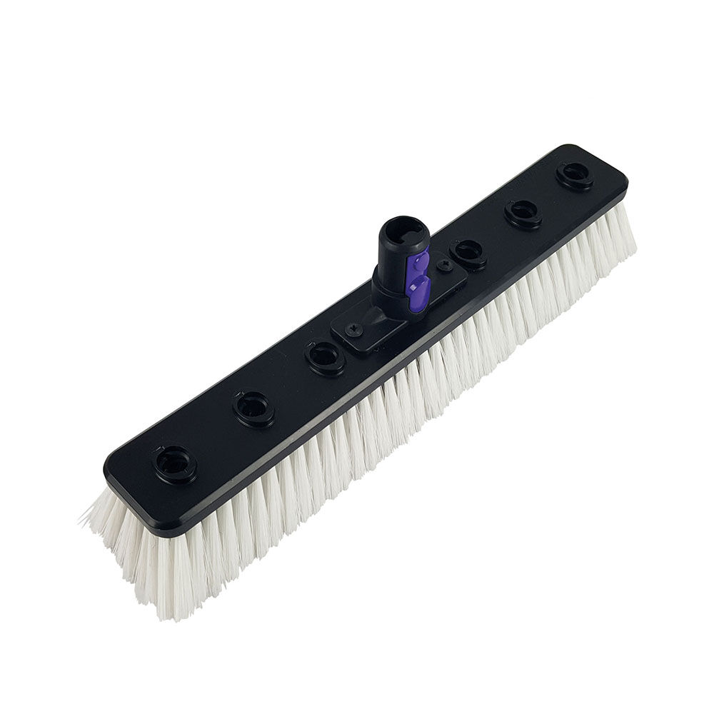 Schwarze Streamline Hi-Lo Winkelbürste mit Gewinde Die neuen STREAMLINE-Bürsten für wasserführende Stangensysteme verfügen über ein modernes Design, mit dem die Wasserdüsen einfach an die Anforderungen des Benutzers angepasst werden können. Die Hi-Lo-Bürste mit weichen Borsten ist sehr leicht und eignet sich für die Reinigung von Fenstern, Sonnenkollektoren und Fassaden. Die weichen Monofilament-Borsten zeichnen sich durch geringe Feuchtigkeitsaufnahme und hohen Memory-Reflex aus. Das heißt, nach Gebrauch kehren sie unmittelbar in ihre ursprüngliche Form zurück! Somit ist die Hi-Lo-Bürste trotz Weichheit sehr robust und langlebig. Mit einer Temperaturbeständigkeit von über 50°C kann die Hi-Lo-Bürste auch in Heißwasseranwendungen eingesetzt werden Vorteile 25 cm oder 36 cm Breite leichtes, langlebiges Design vielseitige Strahlarten und -positionierung formbeständige gesplissene Borsten Produkteigenschaften Arbeitsbreite: 25 cm / 36 cm Gewicht: 381 g Bürste (Farbe): schwarz