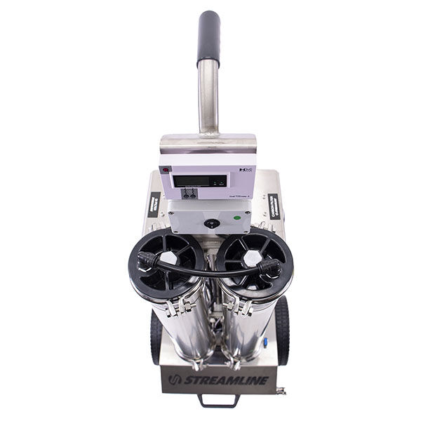 Streamline MOBI MAXI Reinwassersystem für die Reinigung von Glas und harten Oberflächen: kompakt, robust, leistungsstark Das mobile Filtrationssystem  MOBI MAXI von STREAMLINE ist das perfekte transportable System für die Reinigung von Fenstern, Sonnenkollektoren, Booten und vielen anderen harten Oberflächen im Außenbereich. Bei vorhandener Wasser- und Netzstromversorgung (230 V), erzeugt das STREAMLINE MOBI MAXI-Filtersystem genügend Wasser und Druck, um von zwei Anwendern gleichzeitig für Reinigungsarbeiten in bis zu 22 m Höhe genutzt zu werden. Der MOBI MAXI ist die perfekte Lösung für Dienstleister in der Gebäudereinigung, für Glasreiniger u.v.m., die schwer erreichbare Bereiche moderner Gebäude reinigen möchten. z.B. in Innenhöfen oder auf dem Dach gelegene Atrien. Vorteile MOBI MAXI Reinwassersystem kompakter, robuster und stabiler Rahmen kann in horizontaler oder vertikaler Position betrieben werden gleichzeitige Bedienung von zwei Nutzern möglich großes Membrangehäuse aus Edelstahl mit Membran FILTERPLUS 4040 Manometer zur Überwachung des Drucks im Membrangehäuse lüftergekühlte Industrie-Druckerhöhungspumpe, 8,2 Bar, 230 V inkl. Inline-TDS-Messgerät; überwacht die Wasserqualität nach der RO-Filterung und nach der abschließenden DI-Polierfilterung Lieferung komplett mit Schlauchanschlüssen für Einlass, Auslass und Abwasseranschlüsse – geeignet für 1 oder 2 Nutzer, mit separaten Anschlüssen 5 m Stromkabel   Technische Daten MOBI MAXI Filtrationsarten: 5 Mikron Sediment Filter, Umkehrosmose-Membran, DI-Filter max. Druck: 120psi max. Durchflussgeschwindigkeit: 6,3 Liter / Minute* geeigneter TDS-Wert Eingangswasser: 100-600 ppmm endgültiger TDS-Wert Ausgangswasser:   0 ppm Spannung: 230 V Gewicht: ca. 43 kg gleichzeitige Anwender: 2 Personen *unter optimalen Bedingungen