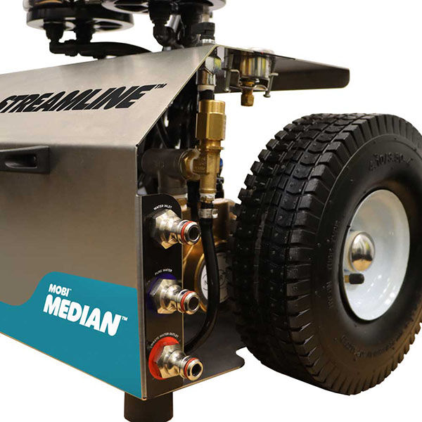 Streamline Mobi Median RO-System Komplettset inkl. Teleskopstange, Bürste, Schlauch & Schlauchwagen Das tragbare System Mobi Median ist die perfekte Lösung für eine effiziente Reinwasserreinigung in verschiedenen Anwendungsbereichen, wie z. B. Fenster, Glasfassaden, Solaranlagen. Das Spülventil des Systems ermöglicht eine einfache Membranspülung, die Verunreinigungen wie Sedimente und Bakterien entfernt, die Lebensdauer der Membran verlängert und Schlieren verhindert. Mit einer leistungsstarken Pumpe und größeren Filtern sorgt das System für eine robuste Filtration und spart Zeit und Geld durch weniger Filterwechsel. Die hohe Durchflussrate von 6 Litern pro Minute ist ideal für die Reinigung großer Flächen und die Beseitigung von hartnäckigem Schmutz an Fenstern. Vereinfachen Sie Ihre Arbeit mit dem Mobi Median System für eine effektive und mühelose Filtration. Zusammen mit der Streamline OVA8 Teleskopstange aus Karbon können Sie in Reinigungsarbeiten in bis zu 9 Metern Höhe ohne Leiter durchführen.  Dieses Reinwasser Set beinhaltet: 1 x RO-Umkehrosmose-System + 18000GPD Double Membranen 1 x Edelstahl-Schlauchwagen inkl. 100 Meter Hi-Viz Schlauch 1 x Streamline OVA-8 Karbon Teleskopstange 9,15 Meter, inkl. Bürste, 260 mm, 1 x Adapter 6 mm, 1 x Anschluss-Kit mit 2 Strahldüsen Vorteile kompaktes mobiles Wasserreinigungssystem leicht zu verstauen und zu transportieren leistungsstarke Pumpe, die mehr Wasser durchdrückt größere Filter für6 Liter Reinwasser pro Minute netzbetrieben schnell abnehmbarer Stecker Einsatzbereiche für das Mobi Median RO System: Glasreinigung Einkaufszentren Reinigung von Sonnenkollektoren Schulen / Campusse / Universitäten Integriertes Spülventil: Ein Spülventil ermöglicht die Spülung der Membranen im System, das die Lebensdauer der RO-Membranen durch die Entfernung von Verunreinigungen wie Sediment, Binsen und Bakterien. Wir empfehlen, Ihre RO-Membran alle 2-3 Monate zu spülen. Höhere Pumpenleistung und größere Filter: Sparen Sie auf lange Sicht Zeit und Geld mit einer höheren Filterkapazität, die längere Filterzyklen und weniger Filterwechsel ermöglicht. Mit einer höheren Wasserdurchflussrate kann eine Hochleistungspumpe auch Wasser mit einer höheren Durchflussrate fördern, was bei der Reinigung größerer Flächen oder bei der Reinigung von Fenstern mit starker Verschmutzung von Vorteil sein kann. Hinweis: Nach Anmerkung des Lieferanten wird sich das Design in Kürze ändern, um die RO-Filter leichter zu entfernen und austauschen zu können. Daher können die aktuellen Bilder der Mobi Median eventuell optisch abweichen. Technische Daten für die Mobi Median Gewicht: 35 kg Betriebsdruck: 6,9 bar Durchflussmenge: 6 Liter pro Minute Filterung: 2 x 4021 RO-Membranen TDS Meter: Inline-TDS mit 2 Probenahmestellen Version: Stromnetz Maße (B x T x H): 50 x 38 x 120 cm Material: Edelstahl VE: 1 Produkteigenschaften Streamline OVA8 Teleskopstange Anzahl der Elemente: 6 Länge eingefahren: 1.865 mm maximale Länge: 9.150 mm erreichbare Höhe: ca. 10 m Stangengewicht: 1,70 kg Schlauchlänge: 12 m Produkteigenschaften Schlauchwagen inkl. Schlauch Schlauchlänge: 100 m Kupplung: 8 mm Abmessungen Schlauchwagen (B x T x H): 50 x 45 x 70 cm