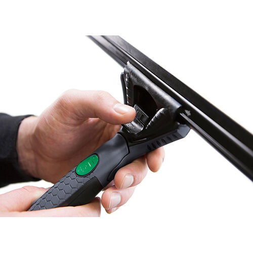 Mit diesem Werkzeug erledigen professionelle Glasreiniger Aufträge mit hoher Präzision und Effizienz. Ein ergonomischer Griff, der perfekt auf die menschliche Hand abgestimmt ist, sorgt mit hochwertiger Anti-Rutsch Gummibeschichtung für exzellente Griffigkeit. Ist zusätzlicher Druck auf die Scheibe erforderlich, kann dieser über dem Daumenbereich auf der Griff-Oberseite ausgeübt werden. Die praktische Sperrtaste des Griffs erlaubt das Fixieren der Mittelposition.